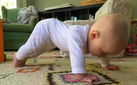 这个月的孩子趴在床上的时候已经可以神气十足地挺胸、抬头,有时还会以腹部为支点在床上打转,这时就可以训练孩子爬行了。开始时,父母可以在孩子面前不太远的地方放上玩具,然后鼓励孩子去抓玩具。孩子向前使劲时,父母可以用手抵住孩子的足底,帮助孩子前进。